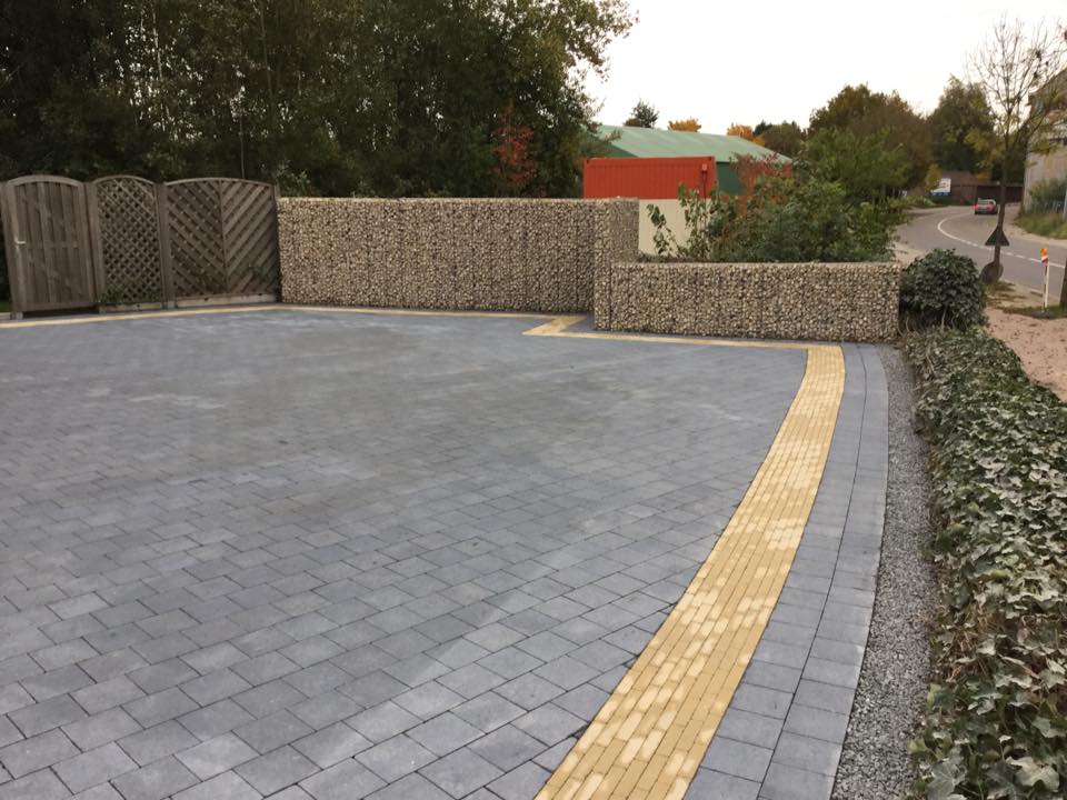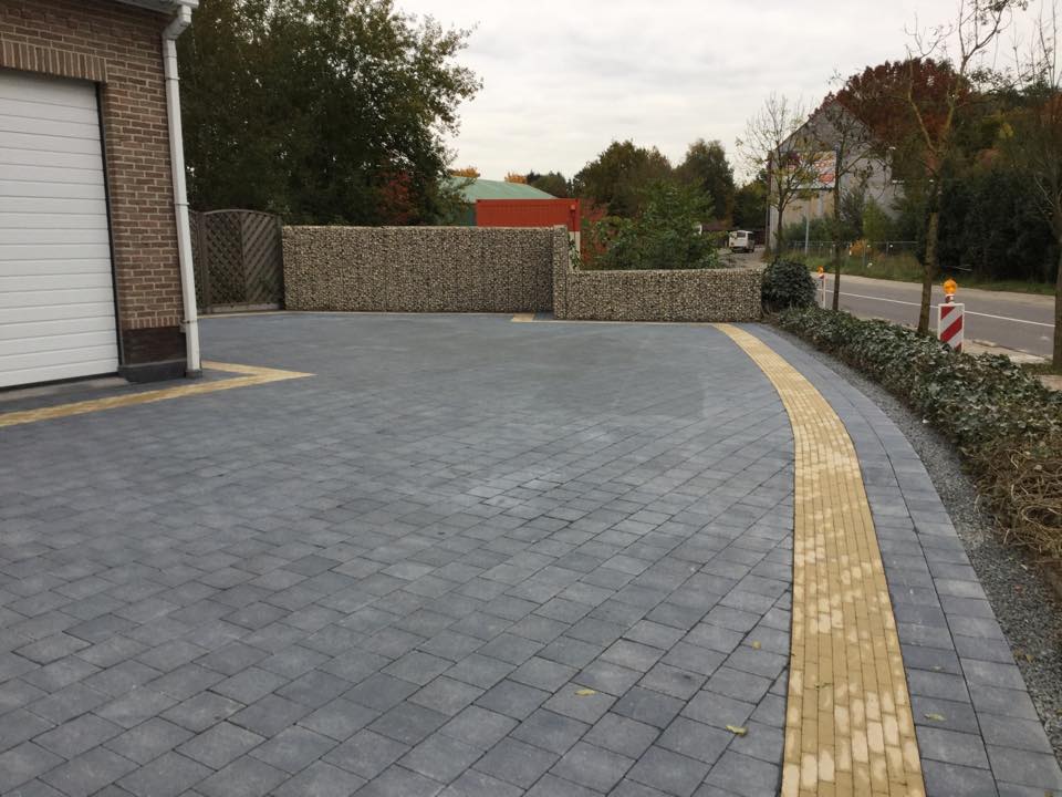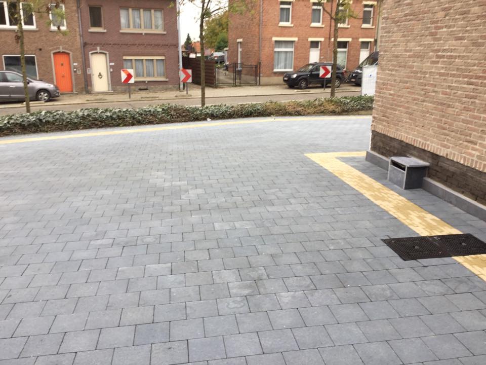 Dit project werd gestart met het afgraven van de totaaloppervlakte (280m²) en het vernieuwen van de riolering. Er werd een stabilisé laag van 22cm geplaatst. De eerste laag van 12cm werd volledig verdicht (aangetrild) met de trilplaat. Een tweede laag werd nogmaals aangetrild, en daarna werd gestart met het egaliseren van de bedding. Hierna volgde plaatsing van de sierklinkers. Aangezien er met 2 kleuren werd gewerkt was er heel wat snijwerk. Na de afwerking werden de klinkers nog een laatste maal aangetrild. Daarna werden nog schanskorven geplaatst op een sokkel van 20cm chape met 250kg cement.
