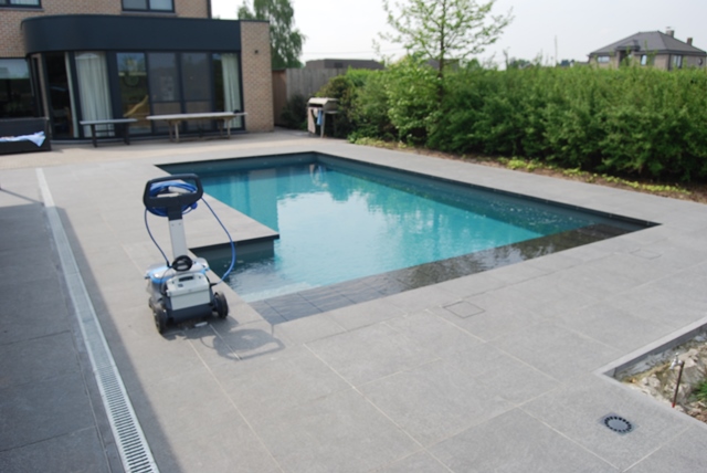 De zwembadranden werden in lijn geplaatst in een mortelbed rechtstreeks op de gemetste zwembadmuur die eerst nog werd ingestreken met Compactuna hechting. De tegels werden geplaatst in een mortelbed op 15 cm stabilisé. Deze tegels weren opgevoegd met grijze cementvoeg. De zwembadranden werden opgespoten met grijze siliconen van Sicasil pool (speciaal bestand tegen chloor). De tegels werden om de 20m² voorzien van een uitzetvoeg, dit om barsten in de cementvoeg van de tegels te voorkomen.