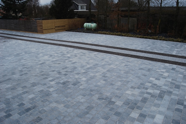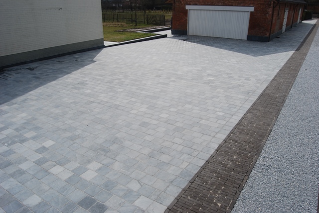 De gehele oppervlakte van 670m² werd 30cm diep afgegraven. onder de 0 pas. Ook hier werd met 2 lagen stabilisé gewerkt: een eerste laag van 20cm werd stevig aangetrild en verdicht. Daarna volgde een laag van 5 cm stabilisé, chapenetten, en mortel. Hierop kwamen de tegels, die met een rubberen hamer werden geplaatst zodat alles 1 geheel vormde. De kleiklinkers werden dan geplaatst op 15cm stabilisé en aangetrild met trilplaat.