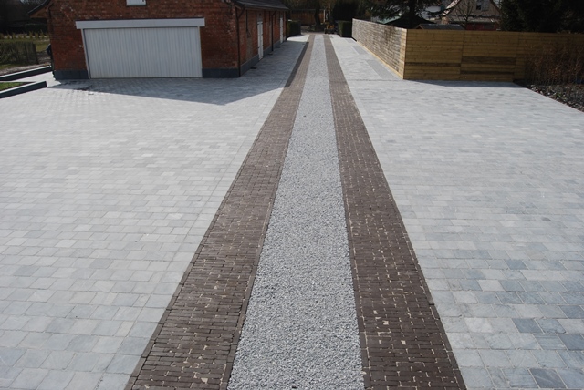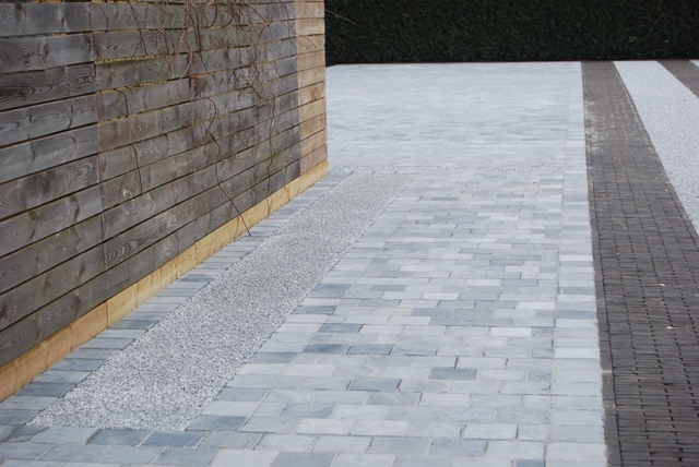 Vervolgens werd een laag grind geplaatst met een dikte van 6cm, op een stabilisé bedding van ca. 12cm. Afsluitend werden de gevelplinten geplaatst. Deze werden volledig ingestreken met tegellijm en tegen de gevels geplaatst, en opgespoten met LM 113 Van Mapei.