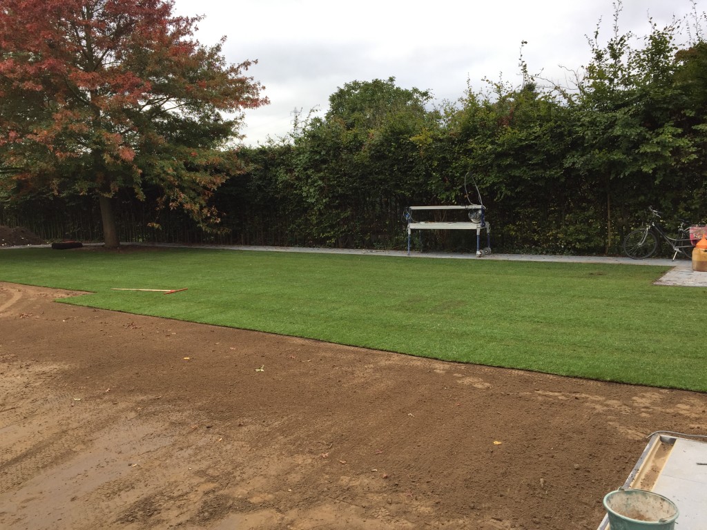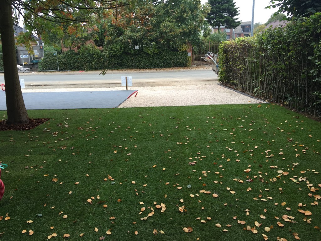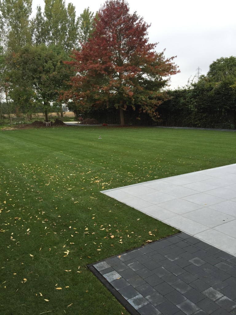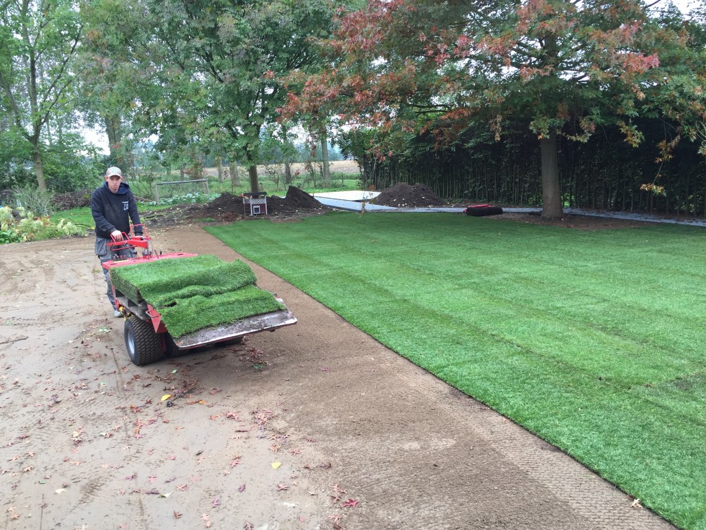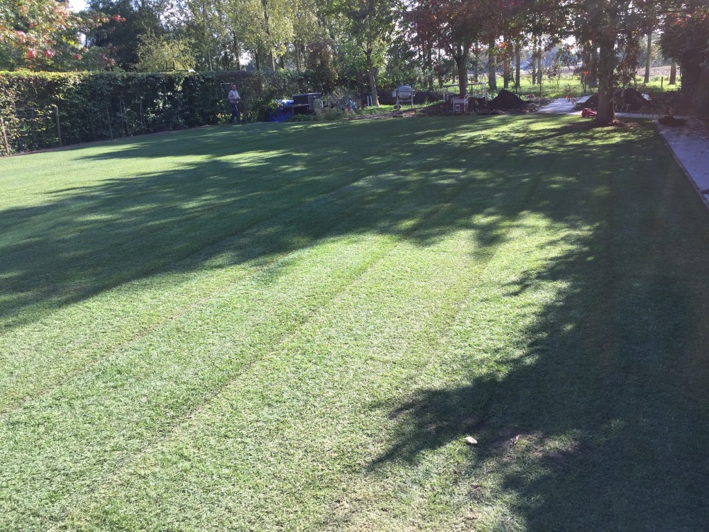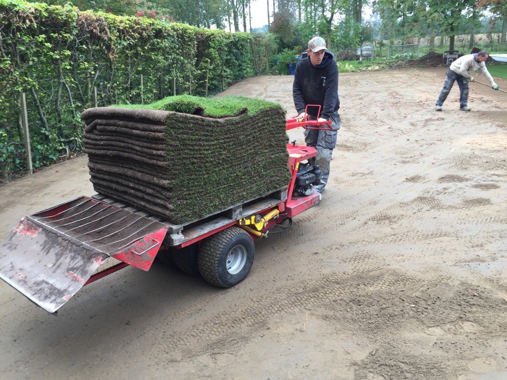 Dit project betreft de aanleg van een grasvlakte van 550m². Er werd gestart met het afgraven van de totale oppervlakte, waarna het omfrezen van de grond volgde, om deze luchtig te maken. Daarna werd er 85 ton bemeste grond aangevoerd, die tevens werd gefreesd zodat deze vermengd werd met de bestaande grond. Hierna volgde het volldig manueel egaliseren van de grond. Afsluitend volgde de plaatsing van de grasrollen (bigg-slabs), met een afmeting van 50m x 1m. Deze worden gelegd met een speciale motorkruiwagen. Zo plaatsen we 50m² in een mum van tijd. Daarna werd de grasvlakte nog 1 keer aangewalst. Hiervoor word een motorische wals van ca. 200kg gebruikt. Daarmee was de grasmat klaar voor gebruik.