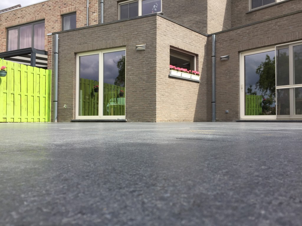 Graafwerken werden uitgevoerd en alle grond werd afgevoerd (oppervlakte was 180m² die moest bekleed worden). Er werd 28cm stabilisé voorzien die in 2 lagen werd geplaatst: een eerste laag van 15 cm, daaarna 7cm stabilizé + chapenetten. De tegels werden hierna in een mortelbed van 2cm geplaatst. Ondertussen werden de tegeldeksels zorgvuldig in een mortelbed geplaatst. De boordstenen werden op het einde tegen de tegels geplaatst, en deze werden net als de uitzetvoegen opgespoten met siliconen LM 113 van Mapei. Wanneer dit alles klaar was werd er siergrind geplaatst, als alernatief voor aqua drain. Het grind doet dienst voor het afvoeren van water bij regenval. Een prima idee om aqua drains te vervangen: de grindstrook.